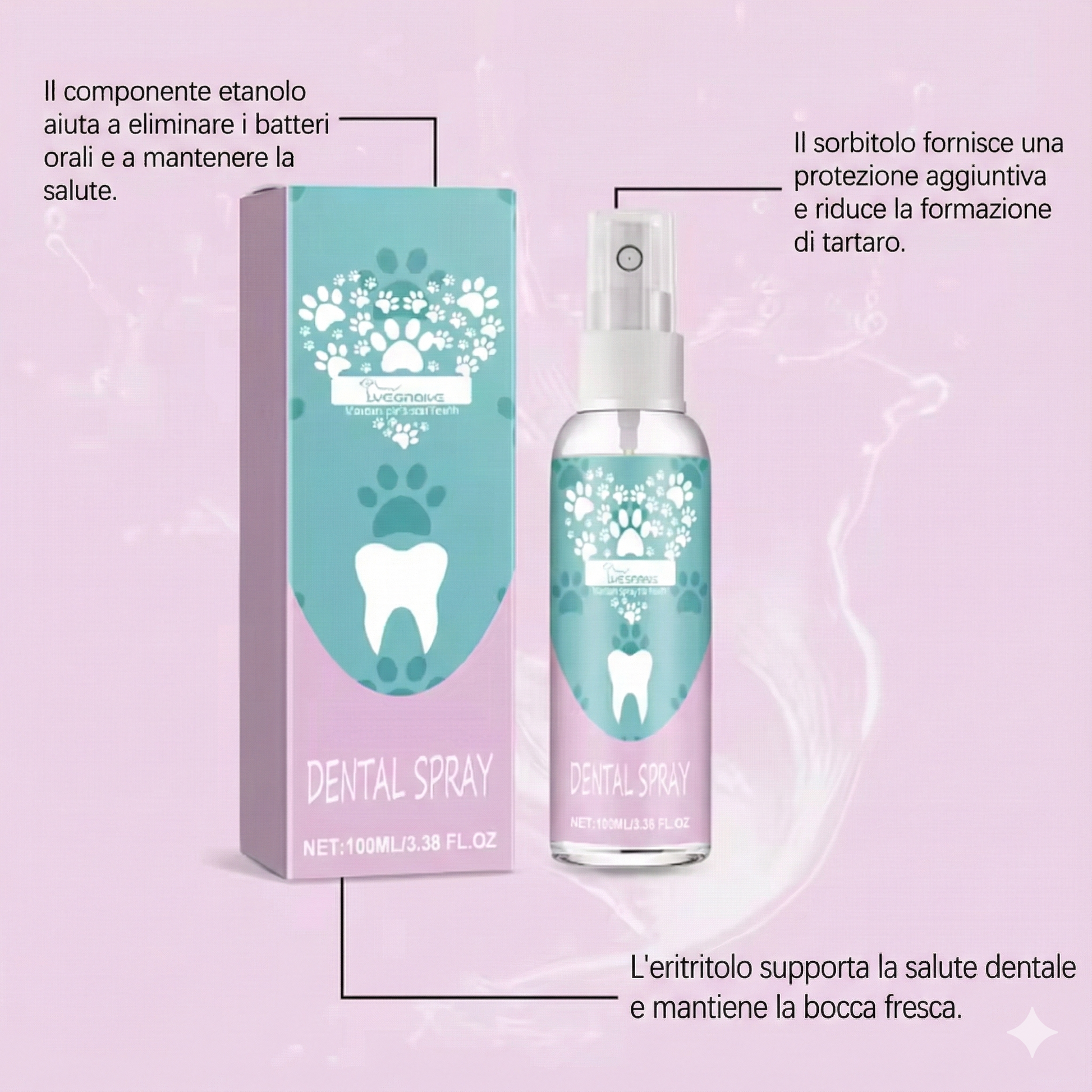 Lo spray dentale funziona benissimo. Il nostro cane (circa 23 kg) aveva molto tartaro. Dopo circa 8 mesi di utilizzo di due spruzzi per lato al giorno, ora ne è rimasto pochissimo. Il tutto senza una sola visita dal veterinario!! Grazie!! Consiglio vivamente questo prodotto!! :-)
