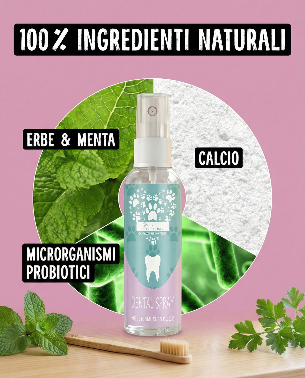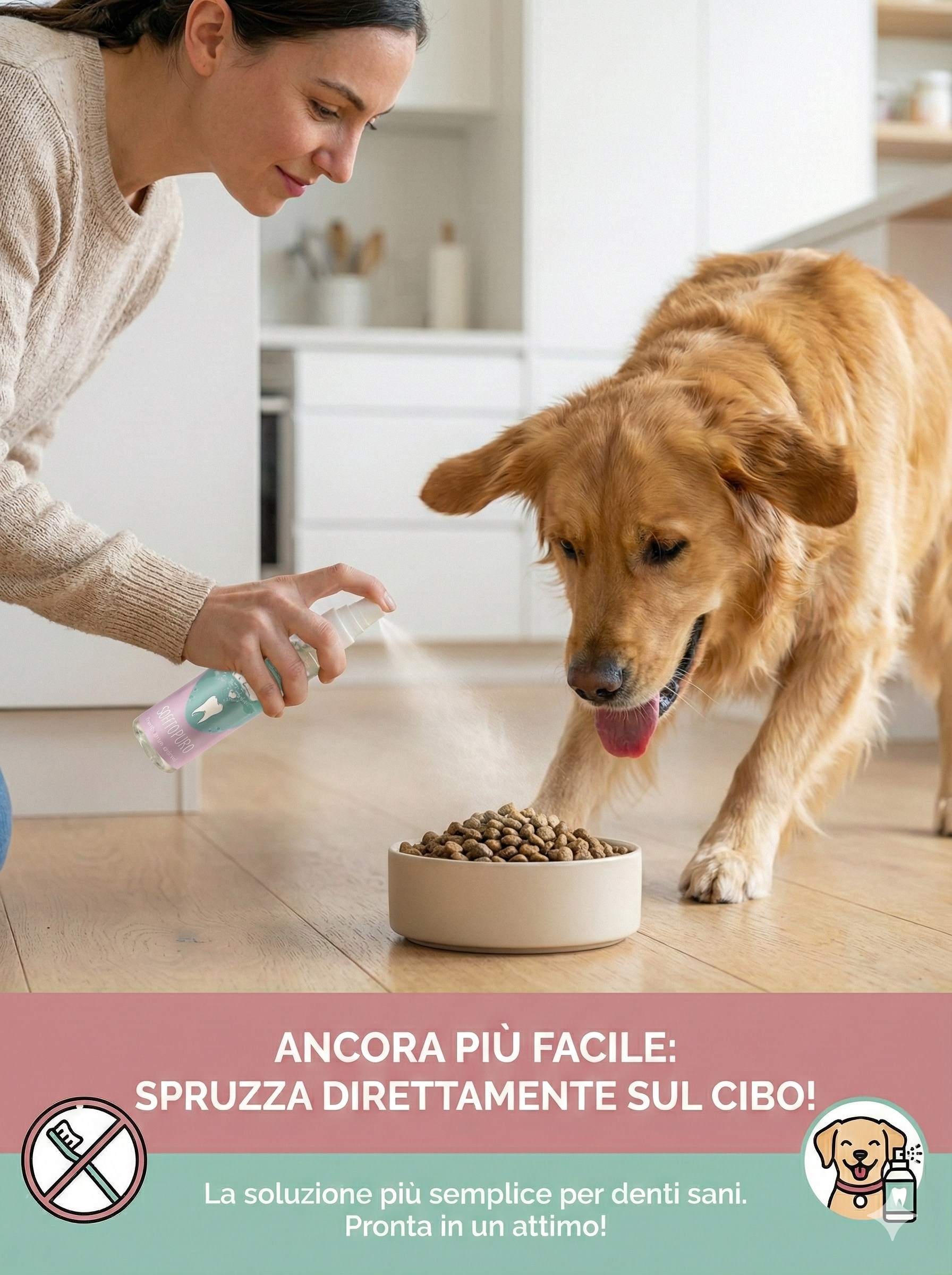 Dimentica lo stress dello spazzolino! L'applicazione è semplicissima: bastano due nebulizzazioni al giorno, da spruzzare sul cibo, su uno snack o direttamente nella bocca del tuo cane o gatto. La nostra potente formula naturale agirà in autonomia per una pulizia profonda.